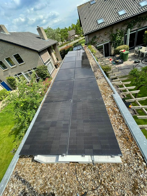 Een SINGLE ROW 20 graden systeem geplaatst op een aanbouw naast een woning. In combinatie met een warmtepomp een duurzame precies op maat gemaakte installatie.