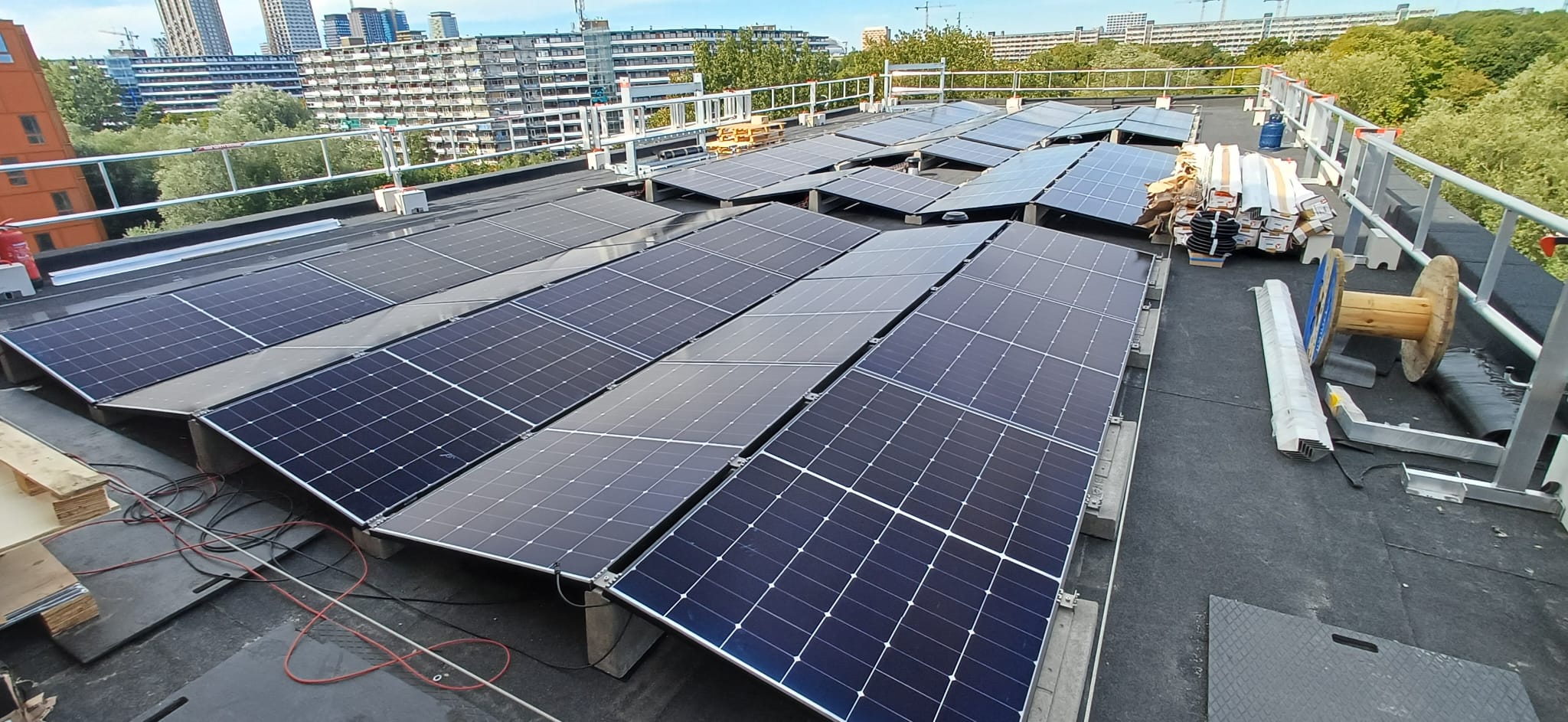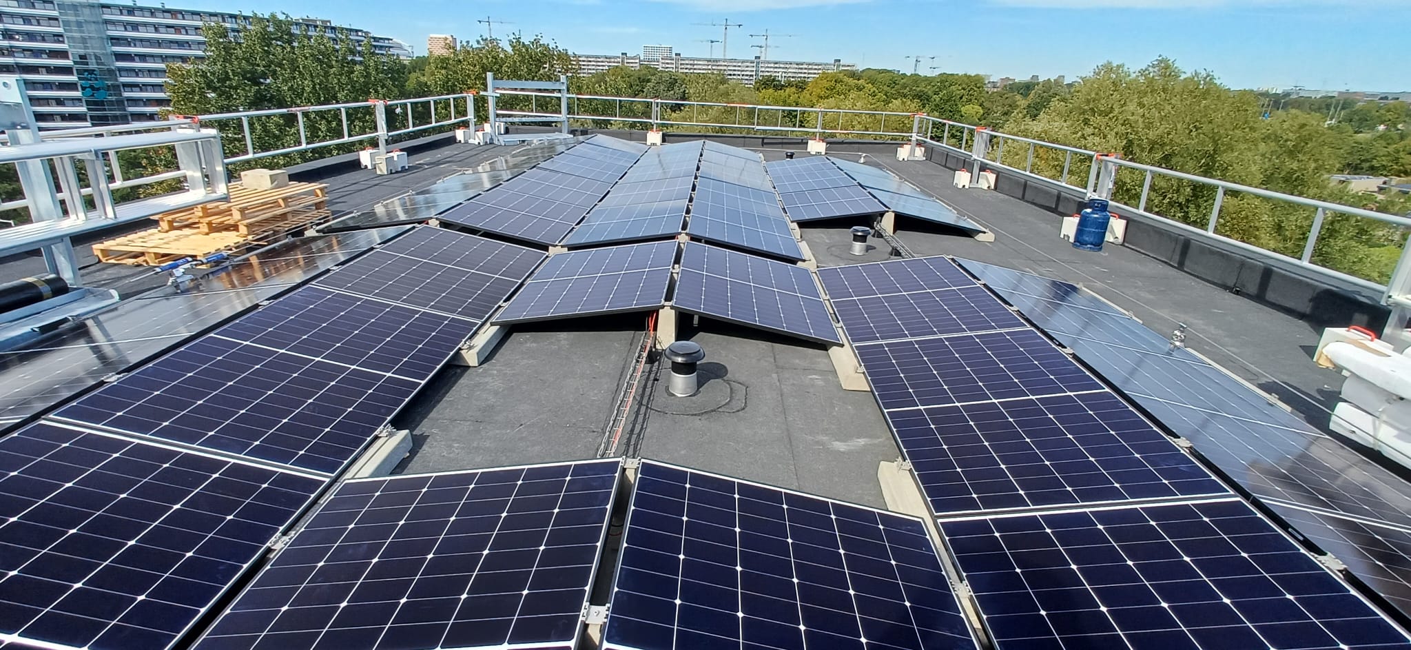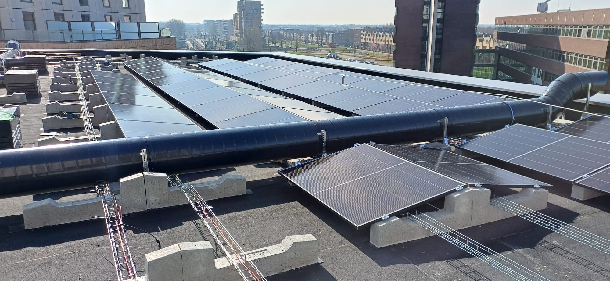 Een EAST-WEST en SINGLE ROW 10 graden systeem gecombineerd op een hoogbouwlocatie met een hoge onvoorspelbare windbelasting. Dus een ideaal project om SunBallast toe te passen.