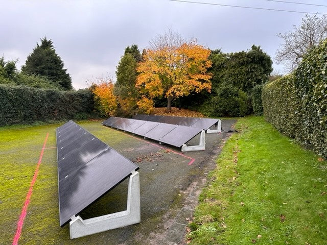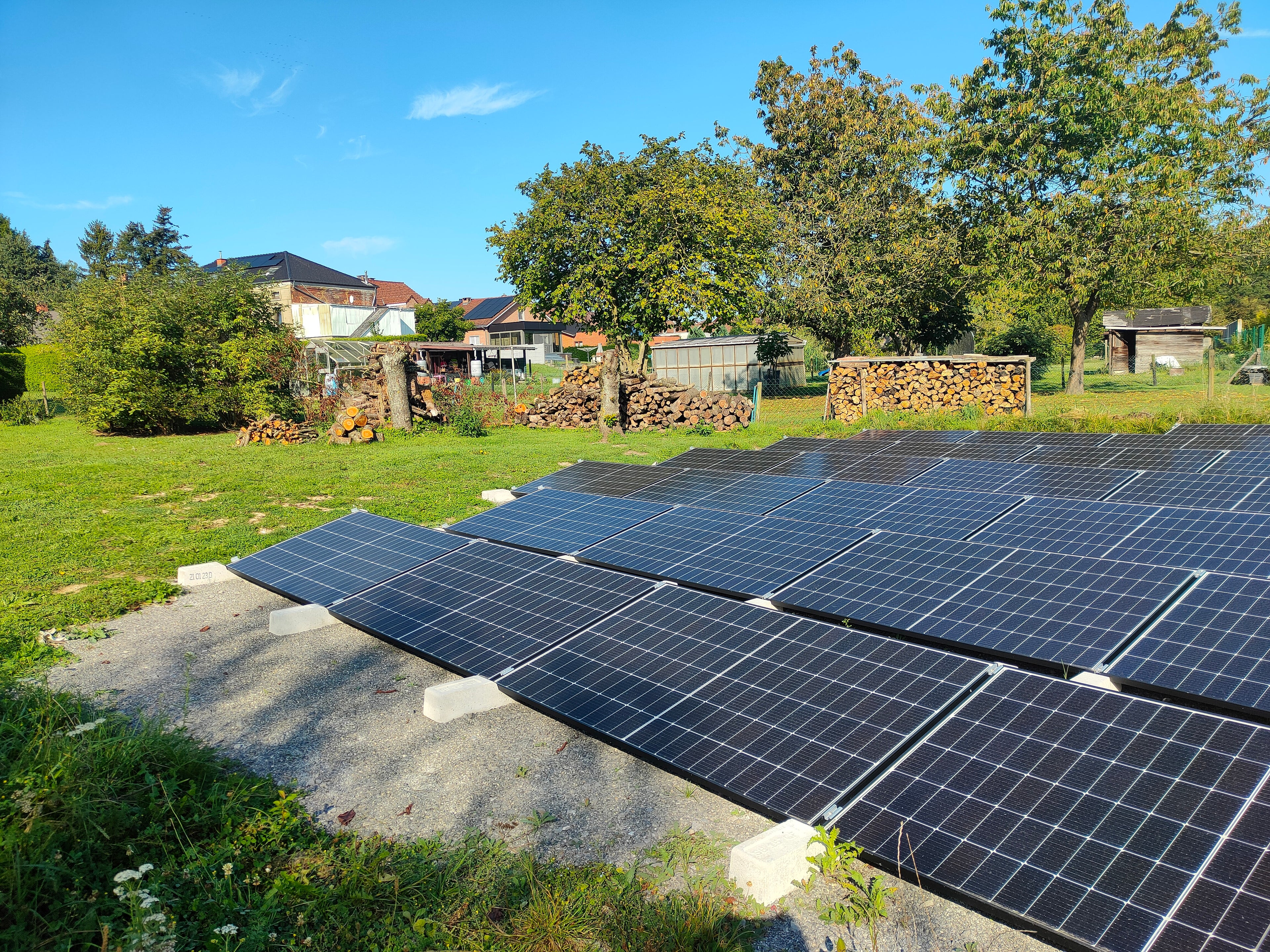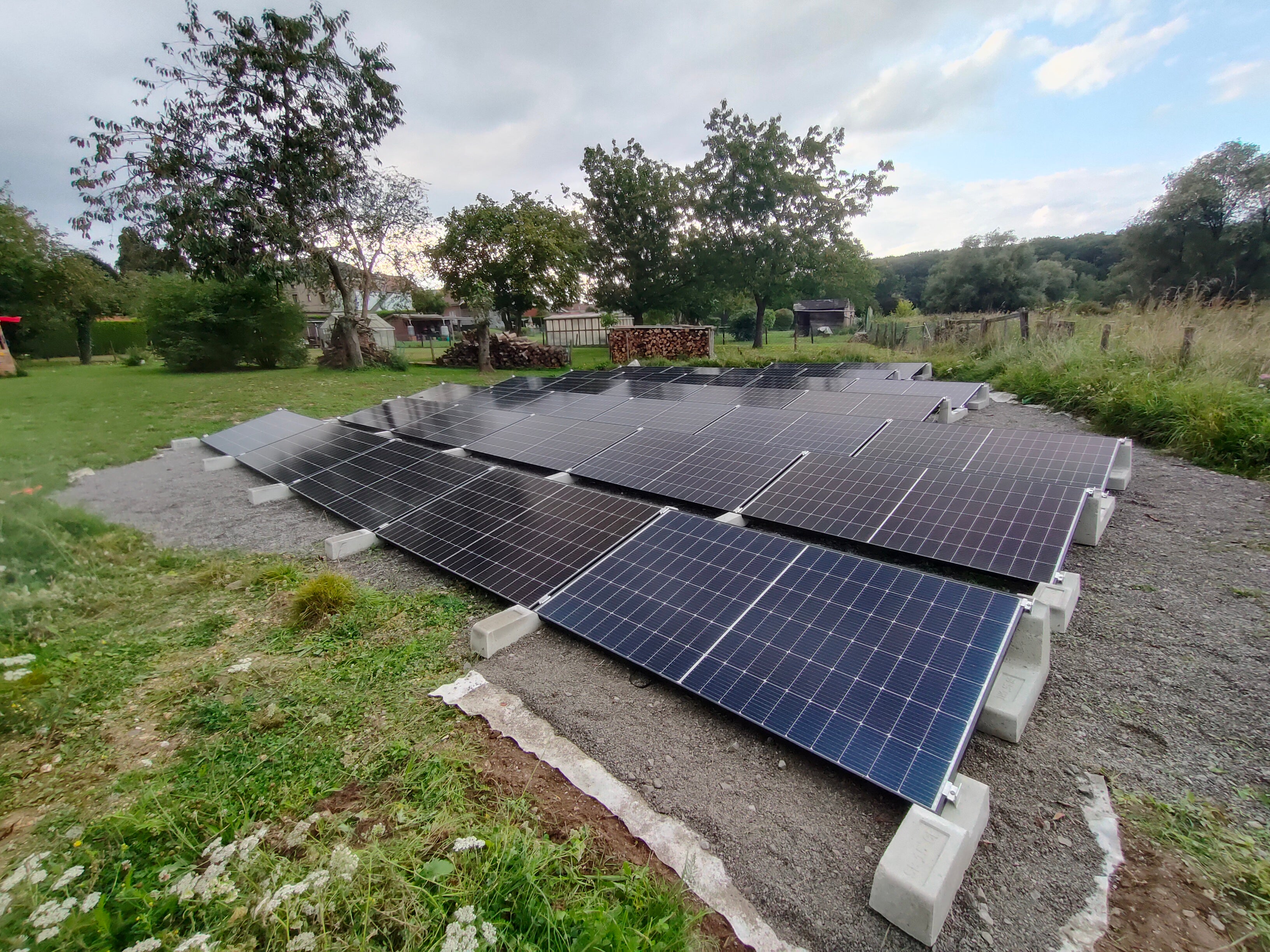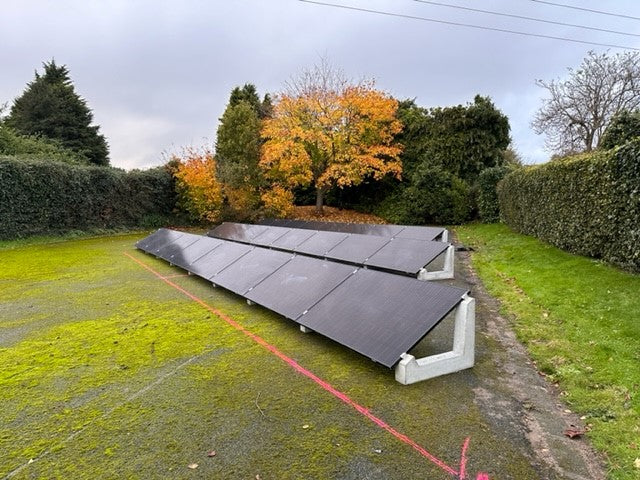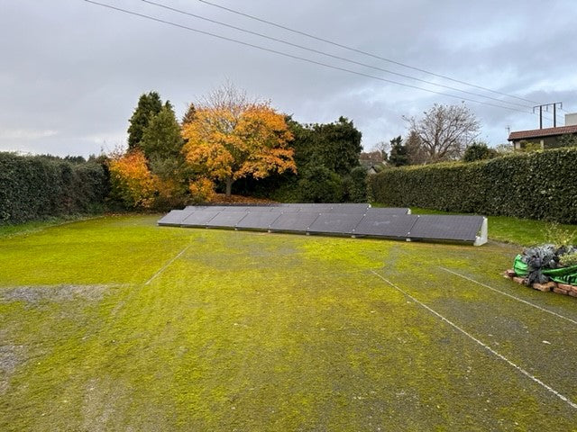 Een connect 15 graden systeem geplaatst in de hoek van een veld aan huis. Een ideale onopvallende oplossing in een buitengebied en zo je eigen energie opwekken als je zelf niet voldoende dakvlak hebt maar wel onbenutte grond.