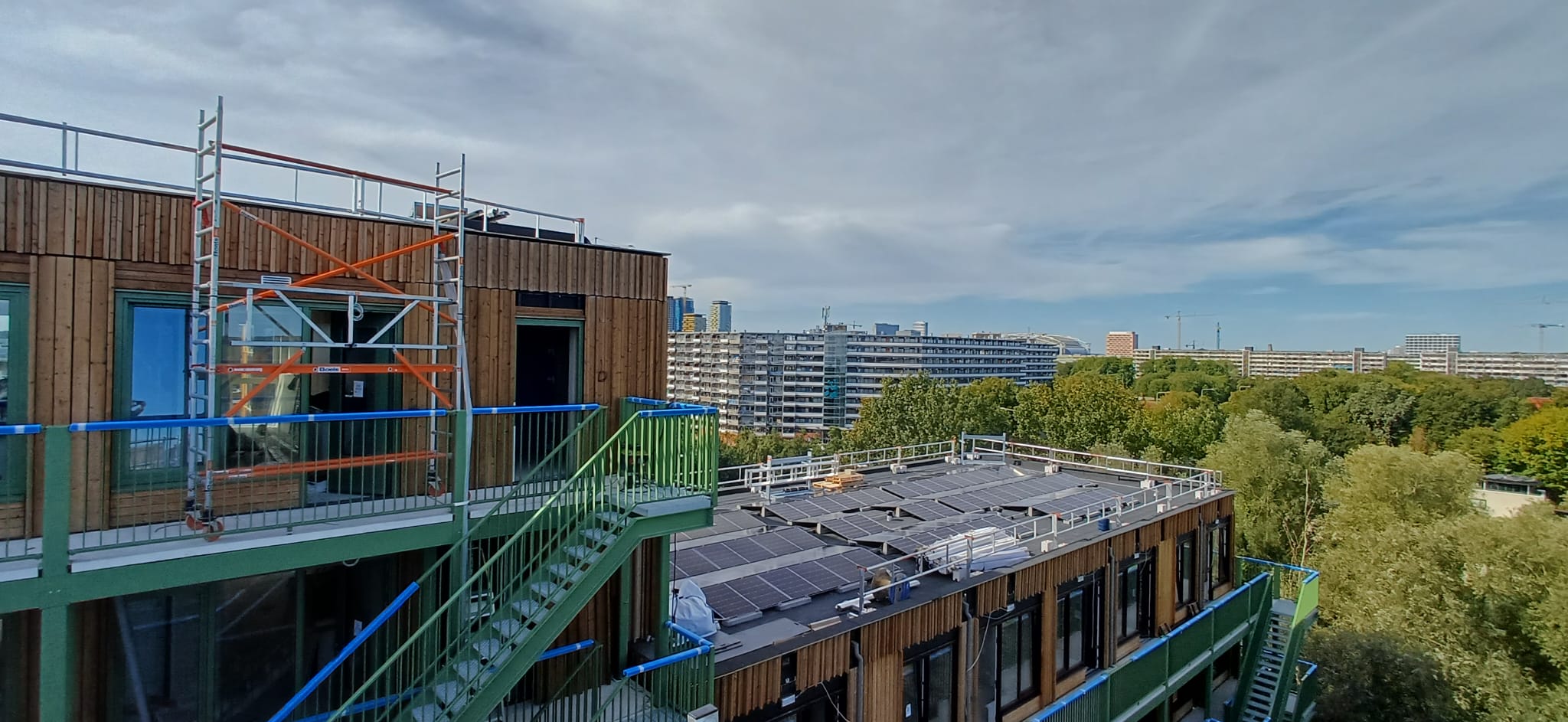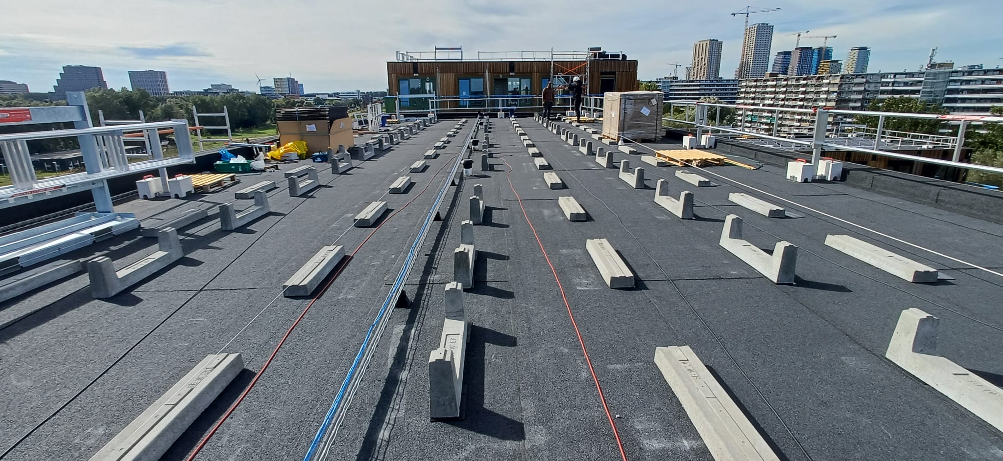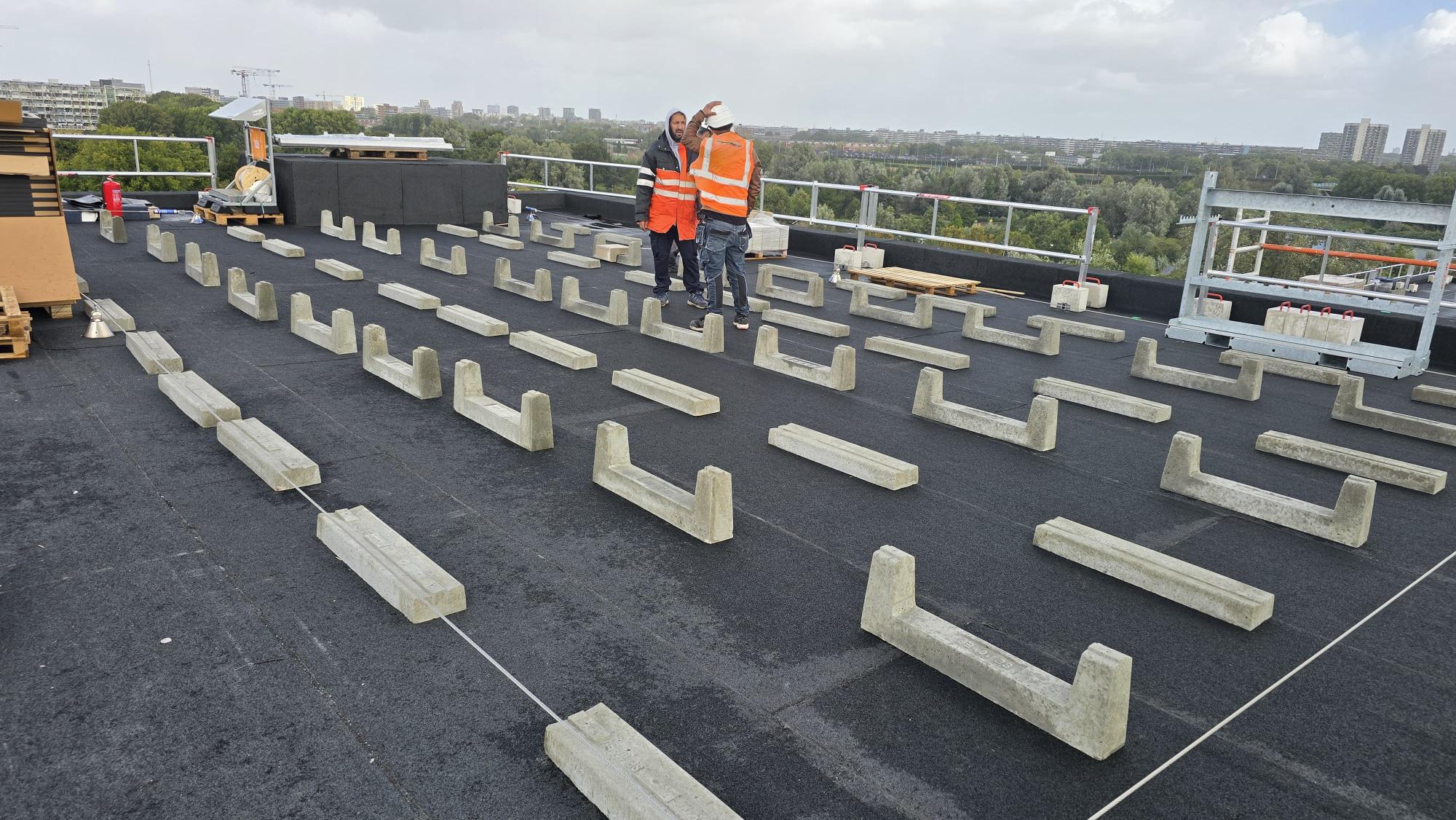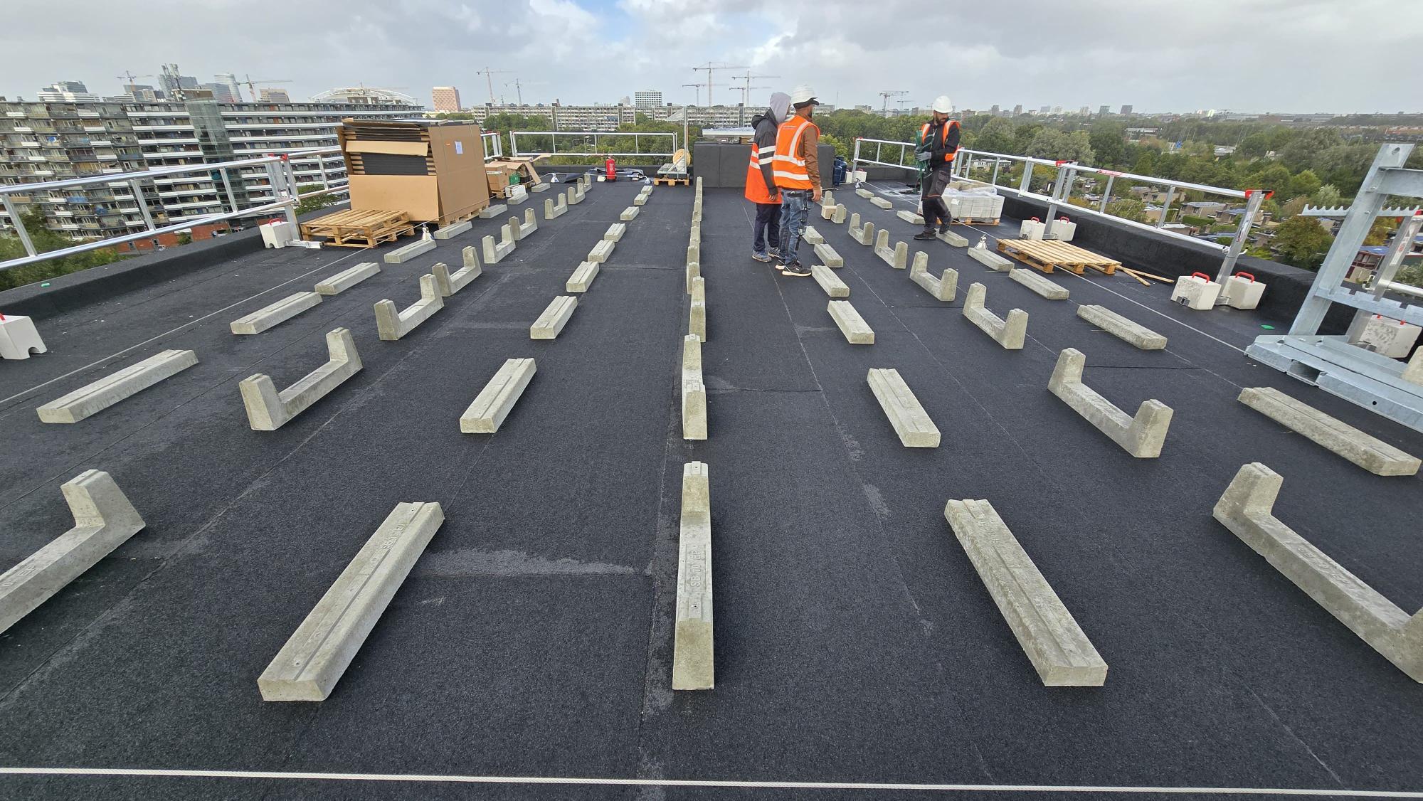In Amsterdam aan het Habaaipad word momenteel dit woonblok gerealiseerd met 120 zonnepanelen op onze EASYWEST SunBallast onderconstructie.
